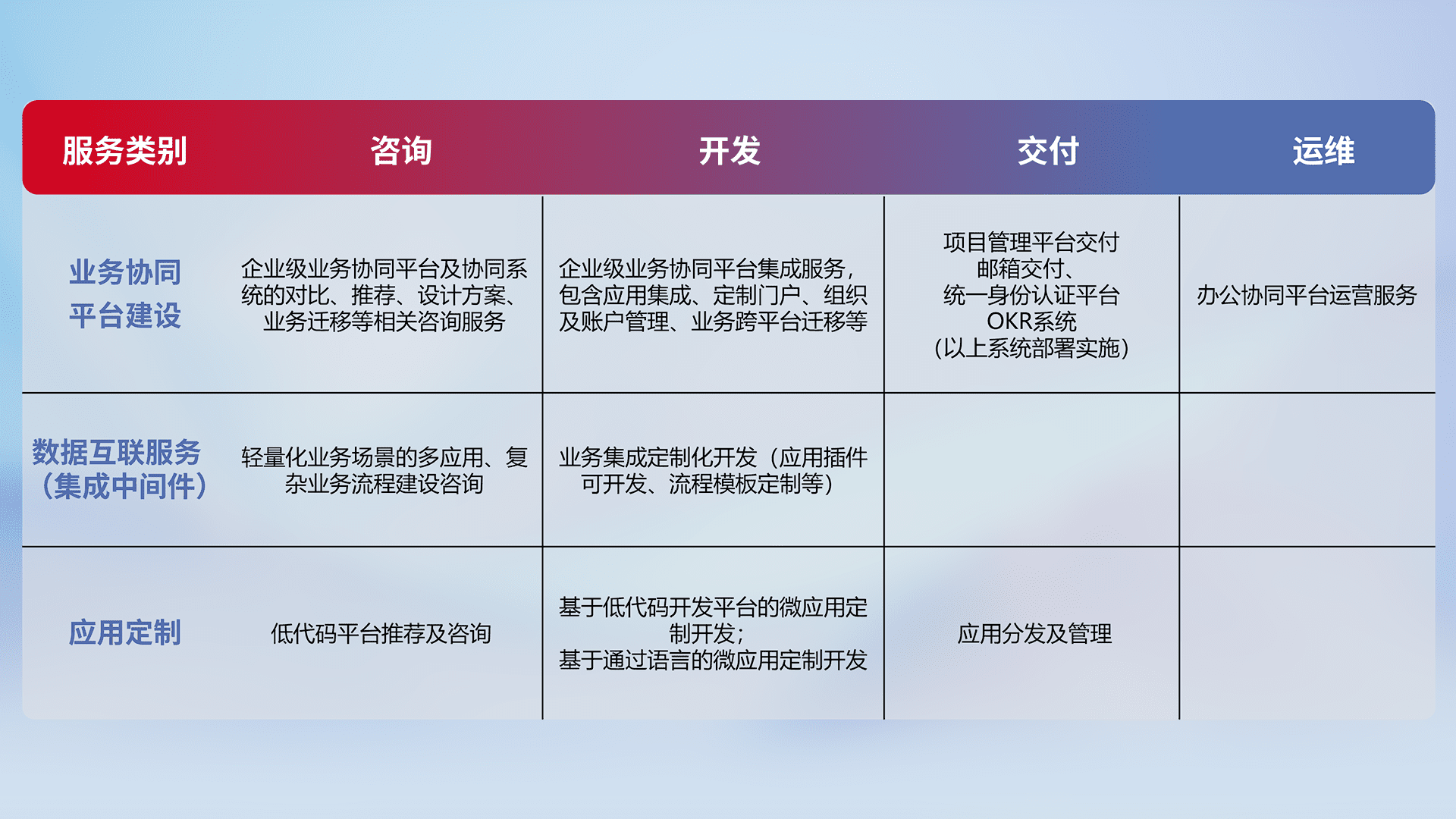 针对钉钉、、、企微、、IDaas等平台级产品提供产品的规划、、、、方案、、、交付、、、、定制化开发等服务,,实现如统一协同办公、、、智能客户服务、、、混合会议管理、、智能数据查询、、等业务场景,,,实现数字化转型。。。